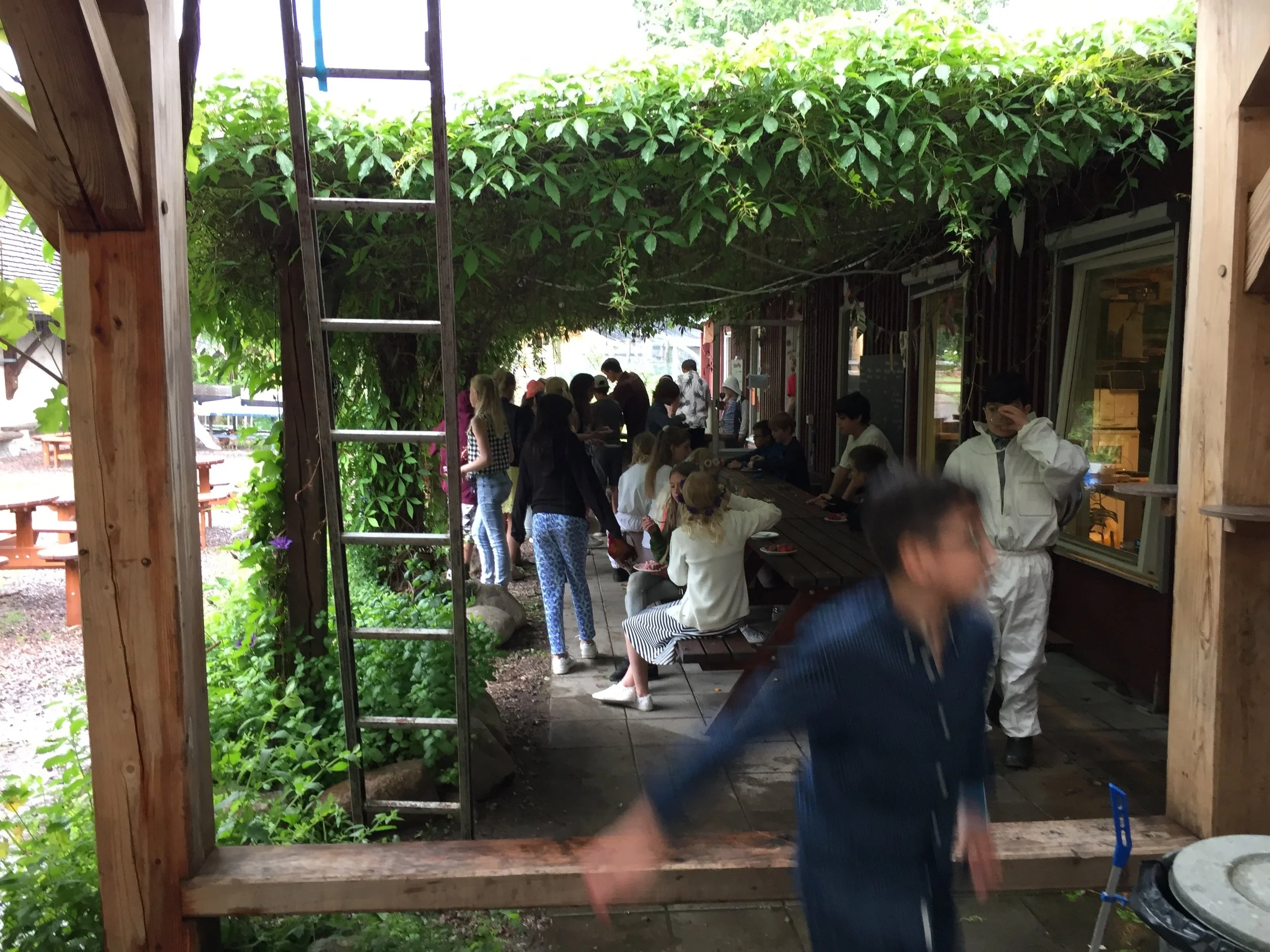 After lunch and sharing, we visited an after school program that will forever be a standard for us when we think of eco-education, engaged, delighted children, and life lived to the fullest out of doors. When we arrived it was pouring rain while a large, happy group of elementary students were enjoying an afternoon snack of organic strawberries picked nearby, a cake that they had made with flour they had ground, served by a group of girls still in their bee protection suits from working the hives. They were all crowded together at outside picnic tables under a long arbor covered in vines and protected from the rain. Some images are forever etched in our memory. This one is of them.
