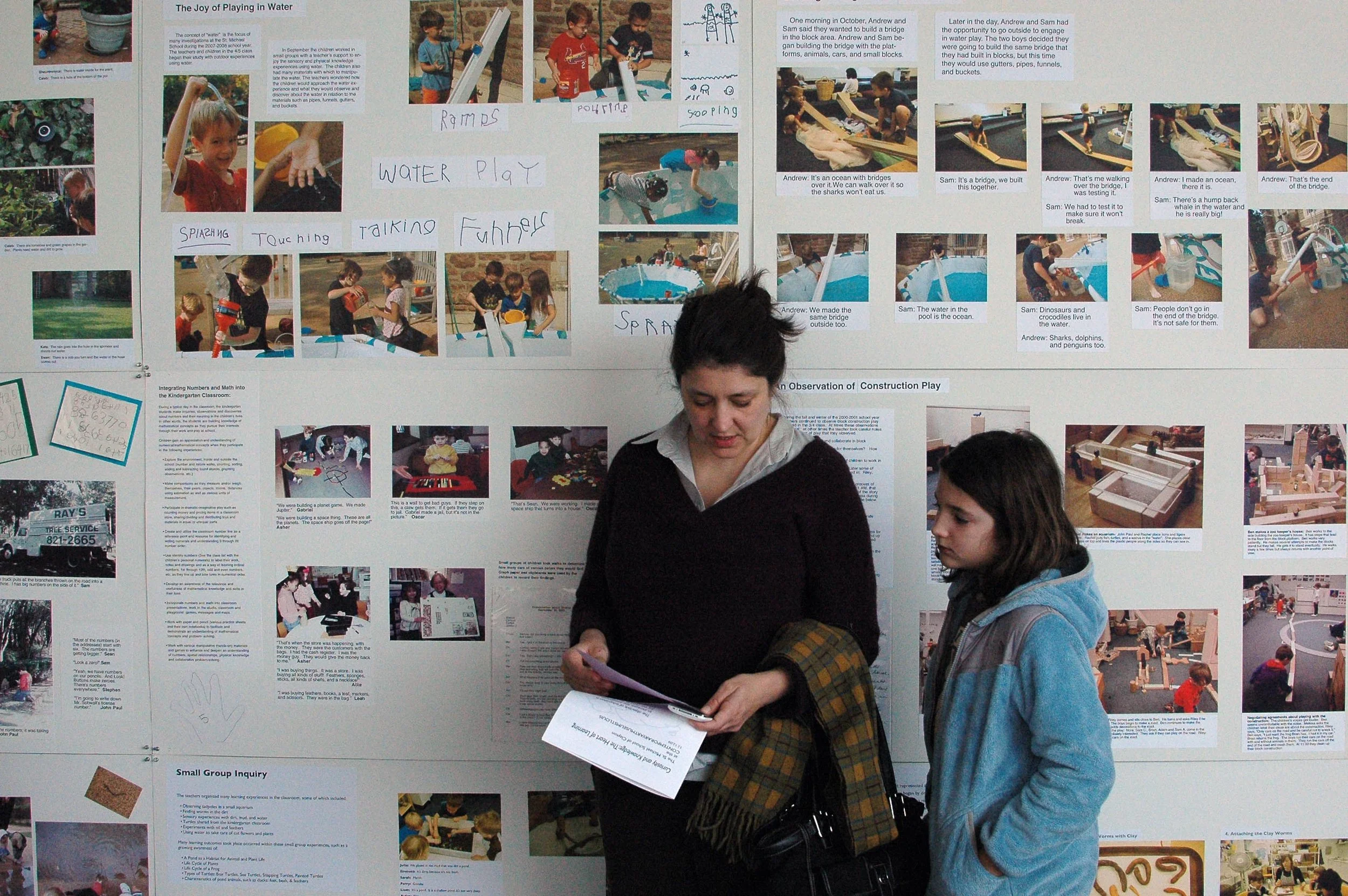 The SMS faculty has been composing documentation panels for over 20 years having adapted this reflective practice from their colleagues/mentors in early childhoods schools in Reggio Emilia, Italy. The first panels were attempts to tell the stories of student projects through teacher narrative, photos of students working, student dialogue and artifacts of student work. Some displays would take up entire walls of the hallways…as large as 4 feet high and 15-20 feet long. Most also included a long and detailed narrative by the guiding teachers…more than you’d want to know…however, each narrative was a concerted attempt to articulate the process that the students went through and to explain the artifacts as evidence of learning.